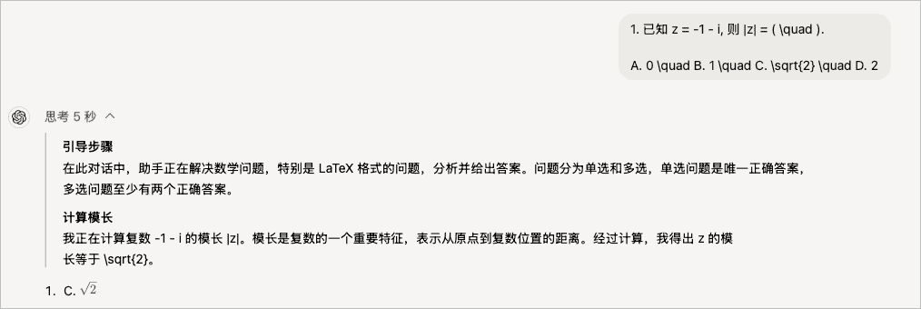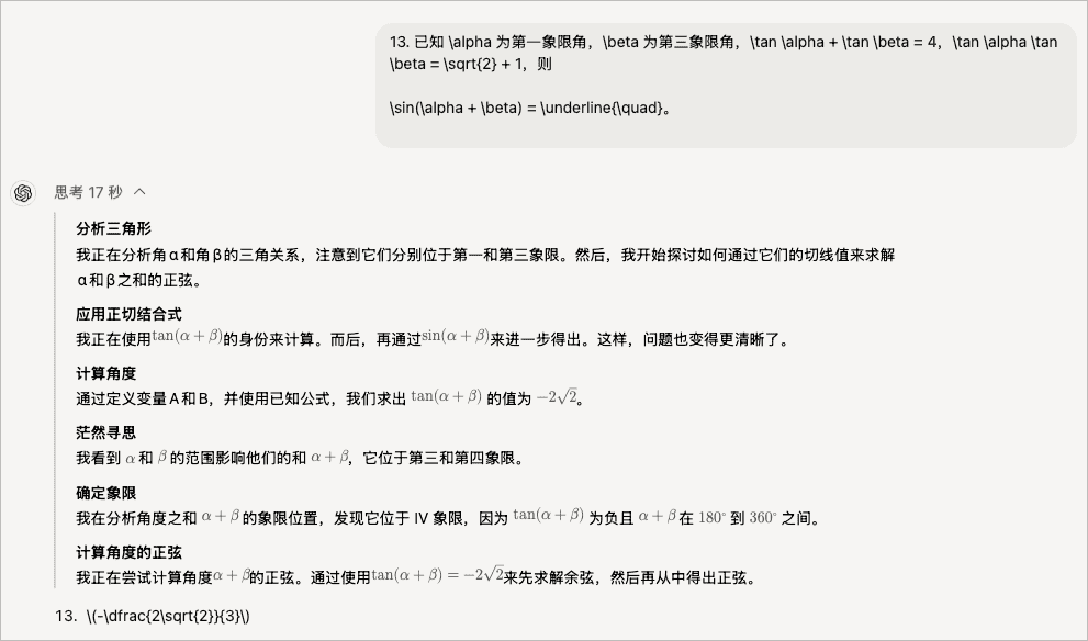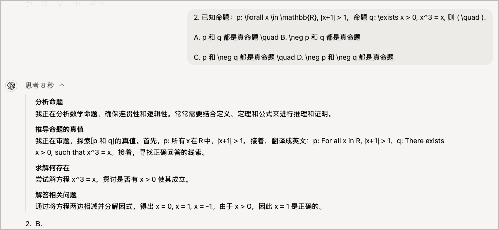 接下来,我开始逐题测试 o1 的能力:每次将一道试题粘贴到对话框中,等待它给出 ABCD 选项中的一个或多个(针对选择题),或者直接填空题的答案。每次答完一道题,我才发送下一道。在这个过程中,我并没有告诉它答案是否正确,也没有给任何额外的提示或指导,甚至没有告诉它哪些是需要重点关注的部分。唯一的“指示”是在多选题和填空题开始时,我简单提醒了一句“接下来是 XXX”。
