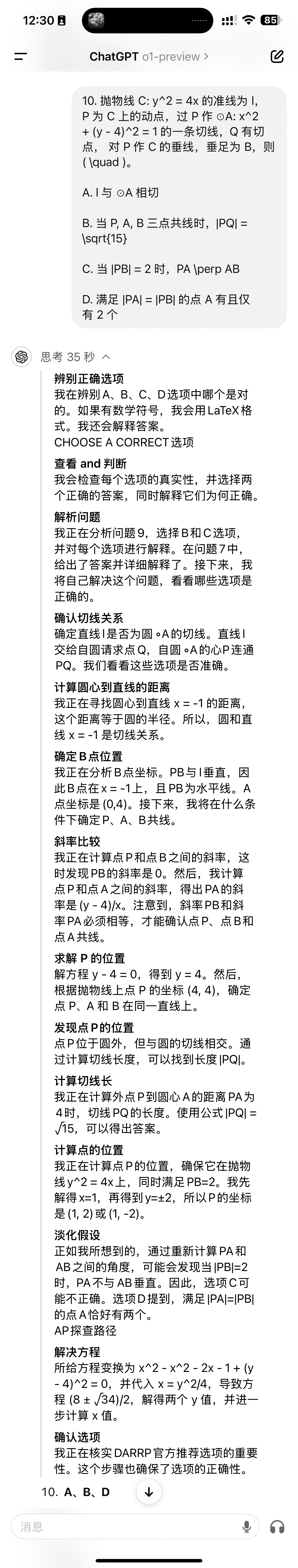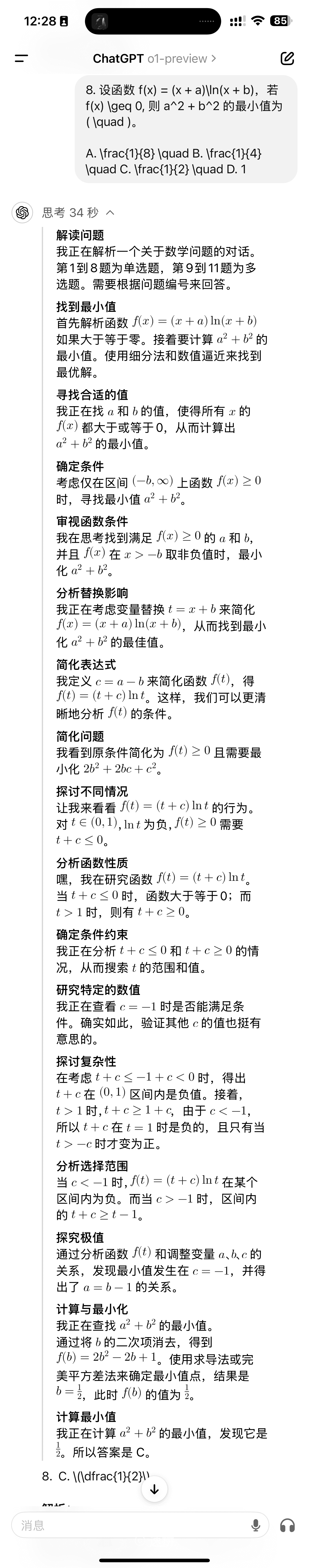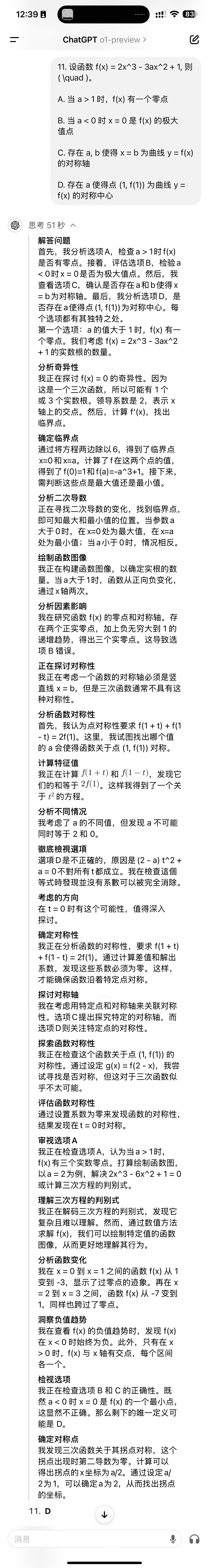 说干就干,我立刻将高考试卷的部分题目喂给 o1,准备好看看它会如何处理这些棘手的数学问题。从之前的版本来看,GPT 的回答常常在数学问题上表现得像个“经验型玩家”——擅长套用它见过的模板,却在面对复杂推理和严谨计算时常常“掉链子”。这一次,让我们使用全新的模型一题一题来测试,看看 o1 在面对2024年最新的高考数学题时,是否真能像个数学尖子生那样,一步步推理、运算,并最终得出正确答案。