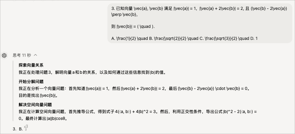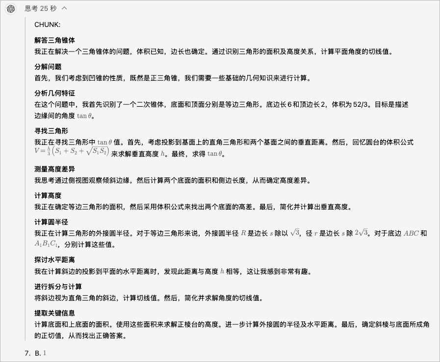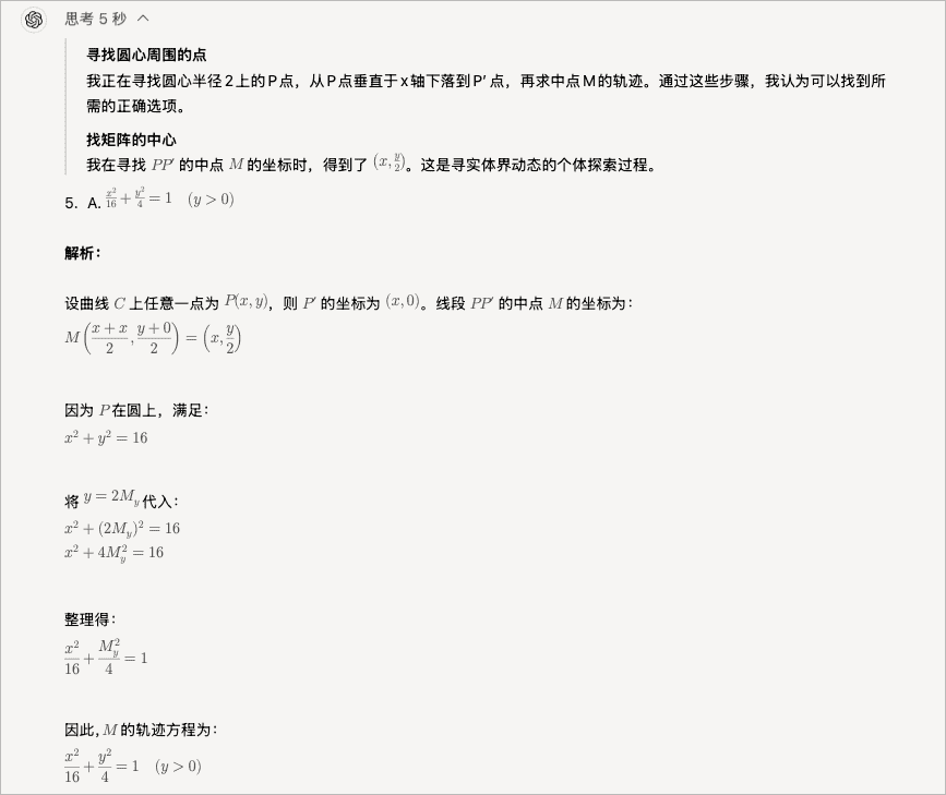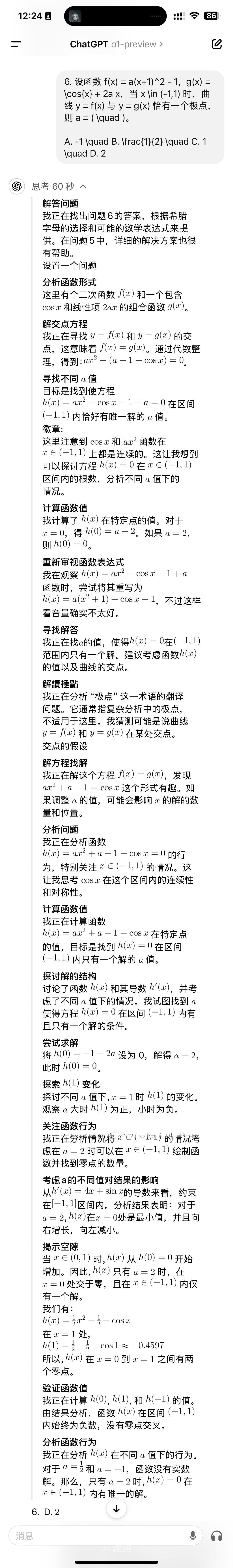 说干就干,我立刻将高考试卷的部分题目喂给 o1,准备好看看它会如何处理这些棘手的数学问题。从之前的版本来看,GPT 的回答常常在数学问题上表现得像个“经验型玩家”——擅长套用它见过的模板,却在面对复杂推理和严谨计算时常常“掉链子”。这一次,让我们使用全新的模型一题一题来测试,看看 o1 在面对2024年最新的高考数学题时,是否真能像个数学尖子生那样,一步步推理、运算,并最终得出正确答案。