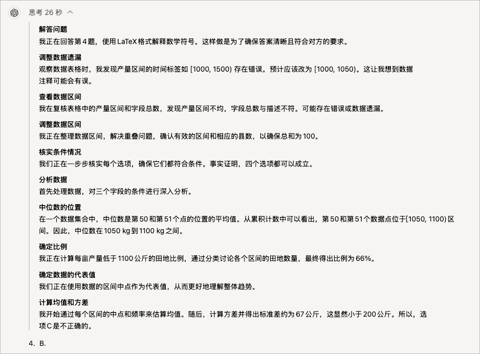 然而,到了选择题的中部,o1 的风格明显发生了变化。它开始为每一个选择进行简要的解释,展示出它对题目的分析和思考过程,好像在说:“这部分稍微有点难度,但我还是能给出合理的推理。”而到了压轴部分,o1 不仅给出答案,还花费了大量篇幅去解释它的推理过程。